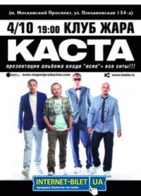 Каста відбудеться 4 жовтня 2012, 19:00, четвер в Клуб "Жара". За допомогою сервісу internet-bilet.ua, Ви зможете з легкістю забронювати, замовити та купити квитки на концерт, спектакль, оперу, балет, майстер-класи, спортивні та дитячі заходи, що Вас цікавлять, оплативши їх найбільш зручним для Вас способом: через інтернет банківською карткою VISA/MasterCard, готівкою або кур'єром, якщо зробите замовлення квитка з доставкою.