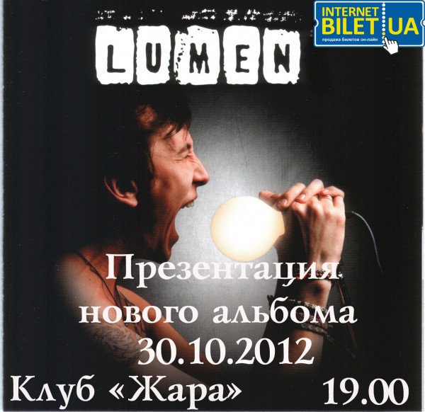 LUMEN відбудеться 30 жовтня 2012, 19:00, вівторок в Клуб "Жара". За допомогою сервісу internet-bilet.ua, Ви зможете з легкістю забронювати, замовити та купити квитки на концерт, спектакль, оперу, балет, майстер-класи, спортивні та дитячі заходи, що Вас цікавлять, оплативши їх найбільш зручним для Вас способом: через інтернет банківською карткою VISA/MasterCard, готівкою або кур'єром, якщо зробите замовлення квитка з доставкою.