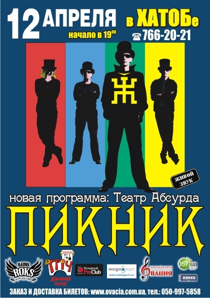 Группа "Пикник" відбудеться 12 квітня 2011, 19:00, вівторок в ХНАТОБ. За допомогою сервісу internet-bilet.ua, Ви зможете з легкістю забронювати, замовити та купити квитки на концерт, спектакль, оперу, балет, майстер-класи, спортивні та дитячі заходи, що Вас цікавлять, оплативши їх найбільш зручним для Вас способом: через інтернет банківською карткою VISA/MasterCard, готівкою або кур'єром, якщо зробите замовлення квитка з доставкою.