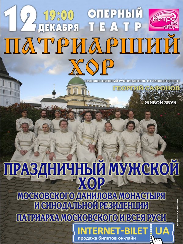 Патриарший Хор відбудеться 12 грудня 2012, 19:00, середа в ХНАТОБ. За допомогою сервісу internet-bilet.ua, Ви зможете з легкістю забронювати, замовити та купити квитки на концерт, спектакль, оперу, балет, майстер-класи, спортивні та дитячі заходи, що Вас цікавлять, оплативши їх найбільш зручним для Вас способом: через інтернет банківською карткою VISA/MasterCard, готівкою або кур'єром, якщо зробите замовлення квитка з доставкою.