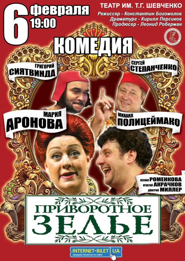 Спектакль "Приворотное зелье" відбудеться 6 лютого 2013, 19:00, середа в Харківський театр ім. Т.Г. Шевченка. За допомогою сервісу internet-bilet.ua, Ви зможете з легкістю забронювати, замовити та купити квитки на концерт, спектакль, оперу, балет, майстер-класи, спортивні та дитячі заходи, що Вас цікавлять, оплативши їх найбільш зручним для Вас способом: через інтернет банківською карткою VISA/MasterCard, готівкою або кур'єром, якщо зробите замовлення квитка з доставкою.