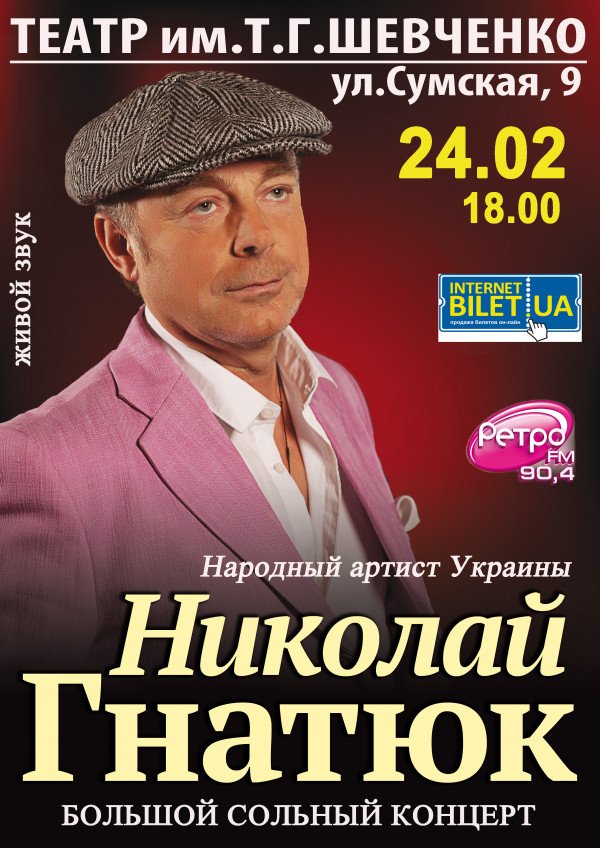 Николай Гнатюк відбудеться 24 лютого 2013, 18:00, неділя в Харківський театр ім. Т.Г. Шевченка. За допомогою сервісу internet-bilet.ua, Ви зможете з легкістю забронювати, замовити та купити квитки на концерт, спектакль, оперу, балет, майстер-класи, спортивні та дитячі заходи, що Вас цікавлять, оплативши їх найбільш зручним для Вас способом: через інтернет банківською карткою VISA/MasterCard, готівкою або кур'єром, якщо зробите замовлення квитка з доставкою.