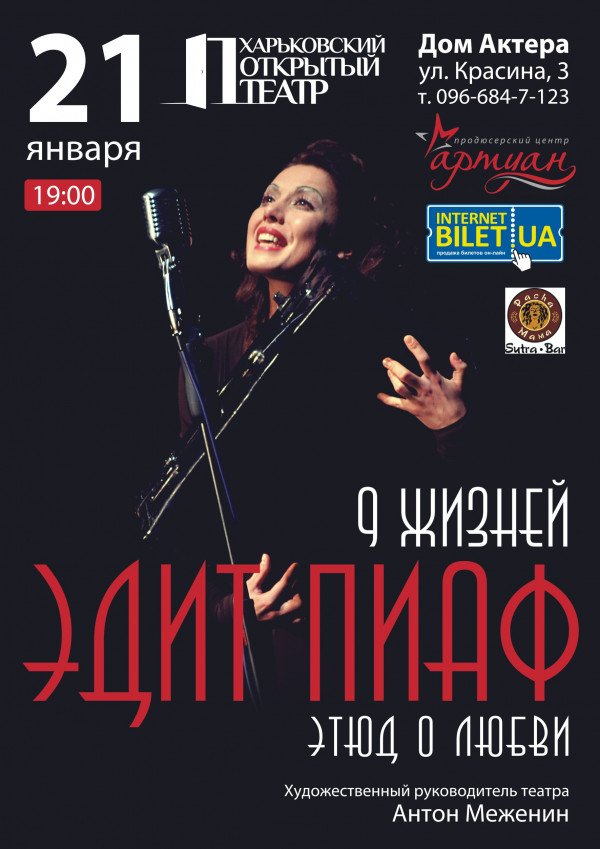 9 жизней Эдит Пиаф відбудеться 21 січня 2013, 19:00, понеділок в Будинок Актора. За допомогою сервісу internet-bilet.ua, Ви зможете з легкістю забронювати, замовити та купити квитки на концерт, спектакль, оперу, балет, майстер-класи, спортивні та дитячі заходи, що Вас цікавлять, оплативши їх найбільш зручним для Вас способом: через інтернет банківською карткою VISA/MasterCard, готівкою або кур'єром, якщо зробите замовлення квитка з доставкою.