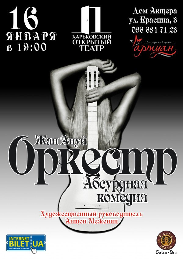 Оркестр відбудеться 16 січня 2013, 19:00, середа в Будинок Актора. За допомогою сервісу internet-bilet.ua, Ви зможете з легкістю забронювати, замовити та купити квитки на концерт, спектакль, оперу, балет, майстер-класи, спортивні та дитячі заходи, що Вас цікавлять, оплативши їх найбільш зручним для Вас способом: через інтернет банківською карткою VISA/MasterCard, готівкою або кур'єром, якщо зробите замовлення квитка з доставкою.
