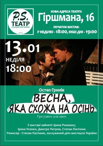 Весна, яка схожа на осінь відбудеться 13 січня 2013, 18:00, неділя в P.S театр. За допомогою сервісу internet-bilet.ua, Ви зможете з легкістю забронювати, замовити та купити квитки на концерт, спектакль, оперу, балет, майстер-класи, спортивні та дитячі заходи, що Вас цікавлять, оплативши їх найбільш зручним для Вас способом: через інтернет банківською карткою VISA/MasterCard, готівкою або кур'єром, якщо зробите замовлення квитка з доставкою.