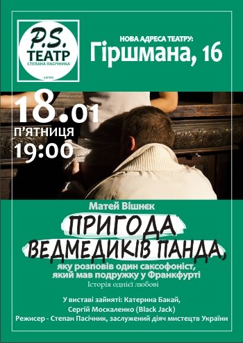 «ПРИГОДА ВЕДМЕДИКІВ ПАНДА» відбудеться 18 січня 2013, 19:00, п’ятниця в P.S театр. За допомогою сервісу internet-bilet.ua, Ви зможете з легкістю забронювати, замовити та купити квитки на концерт, спектакль, оперу, балет, майстер-класи, спортивні та дитячі заходи, що Вас цікавлять, оплативши їх найбільш зручним для Вас способом: через інтернет банківською карткою VISA/MasterCard, готівкою або кур'єром, якщо зробите замовлення квитка з доставкою.