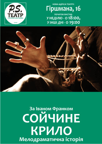 "Сойчине крило" відбудеться 10 лютого 2013, 18:00, неділя в P.S театр. За допомогою сервісу internet-bilet.ua, Ви зможете з легкістю забронювати, замовити та купити квитки на концерт, спектакль, оперу, балет, майстер-класи, спортивні та дитячі заходи, що Вас цікавлять, оплативши їх найбільш зручним для Вас способом: через інтернет банківською карткою VISA/MasterCard, готівкою або кур'єром, якщо зробите замовлення квитка з доставкою.