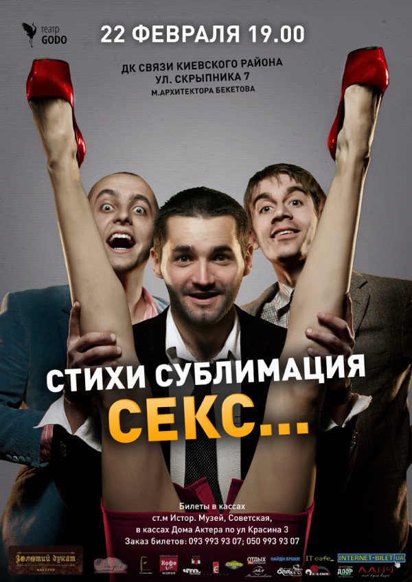 Театр "Godo". Стихи. Сублимация. Секс. відбудеться 22 лютого 2013, 19:00, п’ятниця в Муніципальний центр культурних ініціатив (ПК Зв'язку). За допомогою сервісу internet-bilet.ua, Ви зможете з легкістю забронювати, замовити та купити квитки на концерт, спектакль, оперу, балет, майстер-класи, спортивні та дитячі заходи, що Вас цікавлять, оплативши їх найбільш зручним для Вас способом: через інтернет банківською карткою VISA/MasterCard, готівкою або кур'єром, якщо зробите замовлення квитка з доставкою.