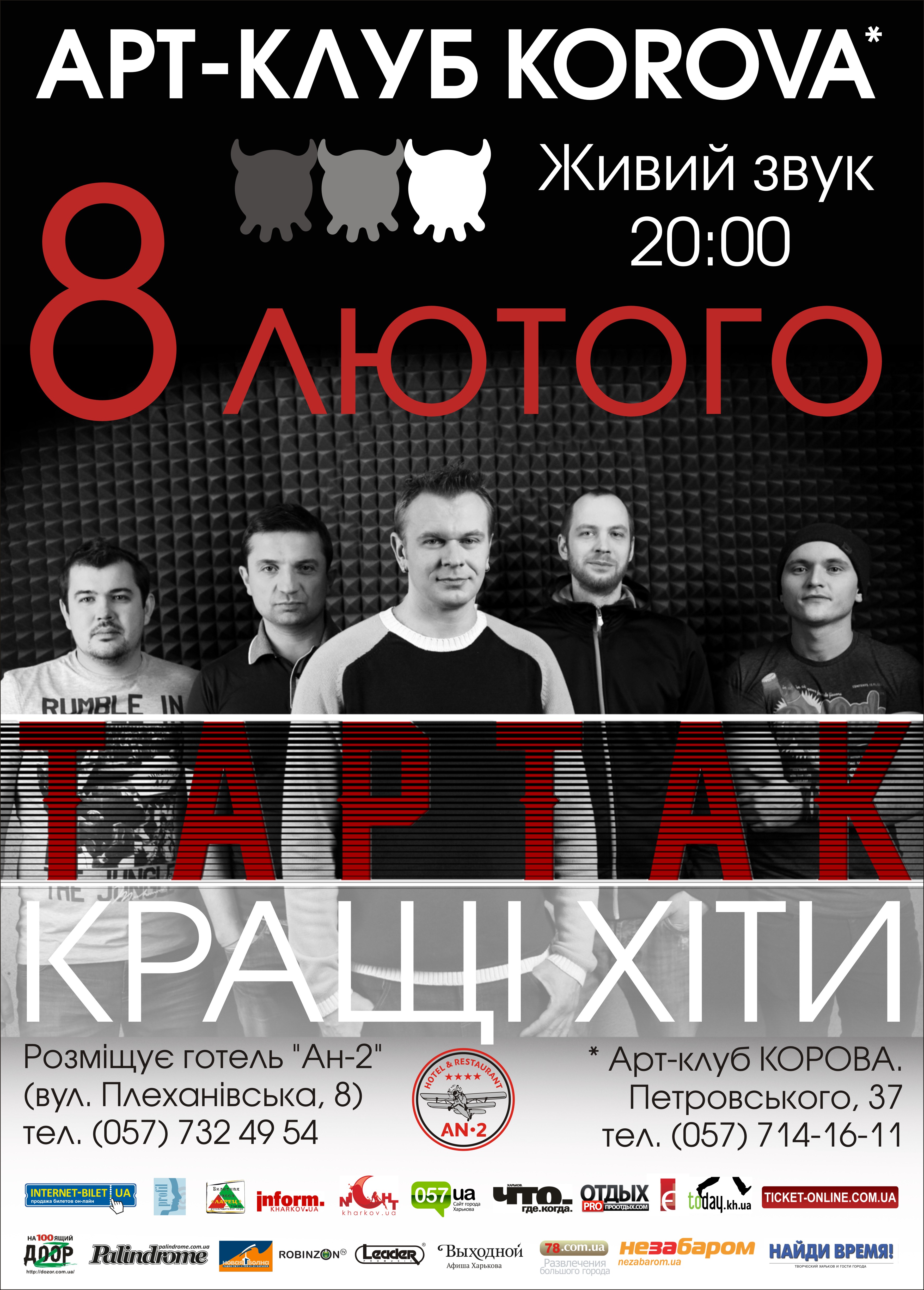Тартак відбудеться 8 лютого 2013, 20:00, п’ятниця в Клуб "Корова". За допомогою сервісу internet-bilet.ua, Ви зможете з легкістю забронювати, замовити та купити квитки на концерт, спектакль, оперу, балет, майстер-класи, спортивні та дитячі заходи, що Вас цікавлять, оплативши їх найбільш зручним для Вас способом: через інтернет банківською карткою VISA/MasterCard, готівкою або кур'єром, якщо зробите замовлення квитка з доставкою.