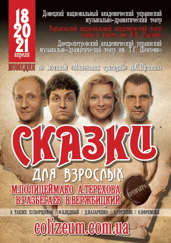 Сказки для взрослых відбудеться 20 квітня 2013, 19:00, субота в ХНАТОБ. За допомогою сервісу internet-bilet.ua, Ви зможете з легкістю забронювати, замовити та купити квитки на концерт, спектакль, оперу, балет, майстер-класи, спортивні та дитячі заходи, що Вас цікавлять, оплативши їх найбільш зручним для Вас способом: через інтернет банківською карткою VISA/MasterCard, готівкою або кур'єром, якщо зробите замовлення квитка з доставкою.