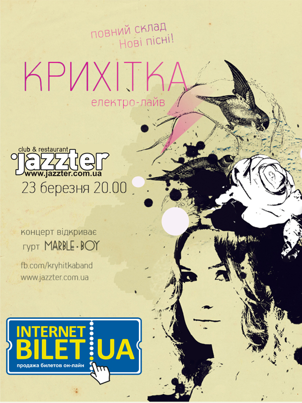 Крихітка відбудеться 23 березня 2013, 20:00, субота в Клуб "Jazzter". За допомогою сервісу internet-bilet.ua, Ви зможете з легкістю забронювати, замовити та купити квитки на концерт, спектакль, оперу, балет, майстер-класи, спортивні та дитячі заходи, що Вас цікавлять, оплативши їх найбільш зручним для Вас способом: через інтернет банківською карткою VISA/MasterCard, готівкою або кур'єром, якщо зробите замовлення квитка з доставкою.