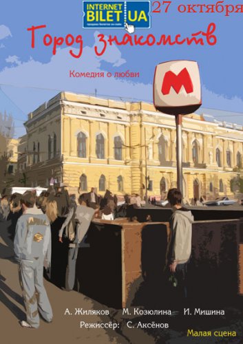 Город знакомств відбудеться 27 квітня 2013, 19:00, субота в Будинок Актора. За допомогою сервісу internet-bilet.ua, Ви зможете з легкістю забронювати, замовити та купити квитки на концерт, спектакль, оперу, балет, майстер-класи, спортивні та дитячі заходи, що Вас цікавлять, оплативши їх найбільш зручним для Вас способом: через інтернет банківською карткою VISA/MasterCard, готівкою або кур'єром, якщо зробите замовлення квитка з доставкою.