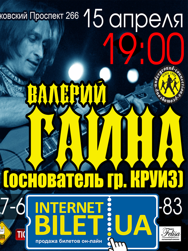 Валерий Гаина відбудеться 15 квітня 2013, 19:00, понеділок в Клуб "ROYAL". За допомогою сервісу internet-bilet.ua, Ви зможете з легкістю забронювати, замовити та купити квитки на концерт, спектакль, оперу, балет, майстер-класи, спортивні та дитячі заходи, що Вас цікавлять, оплативши їх найбільш зручним для Вас способом: через інтернет банківською карткою VISA/MasterCard, готівкою або кур'єром, якщо зробите замовлення квитка з доставкою.