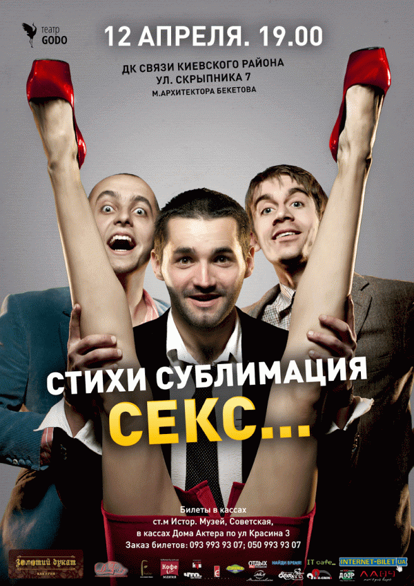 Театр "Godo". Стихи. Сублимация. Секс. відбудеться 12 квітня 2013, 19:00, п’ятниця в Муніципальний центр культурних ініціатив (ПК Зв'язку). За допомогою сервісу internet-bilet.ua, Ви зможете з легкістю забронювати, замовити та купити квитки на концерт, спектакль, оперу, балет, майстер-класи, спортивні та дитячі заходи, що Вас цікавлять, оплативши їх найбільш зручним для Вас способом: через інтернет банківською карткою VISA/MasterCard, готівкою або кур'єром, якщо зробите замовлення квитка з доставкою.