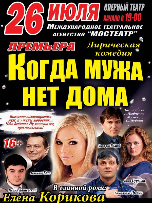 Когда мужа нет дома. відбудеться 26 липня 2013, 19:00, п’ятниця в ХНАТОБ. За допомогою сервісу internet-bilet.ua, Ви зможете з легкістю забронювати, замовити та купити квитки на концерт, спектакль, оперу, балет, майстер-класи, спортивні та дитячі заходи, що Вас цікавлять, оплативши їх найбільш зручним для Вас способом: через інтернет банківською карткою VISA/MasterCard, готівкою або кур'єром, якщо зробите замовлення квитка з доставкою.