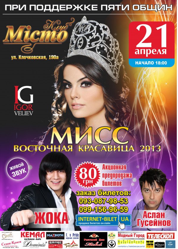 Мисс Восточная красавица 2013 відбудеться 21 квітня 2013, 18:00, неділя в Клуб "Мiсто". За допомогою сервісу internet-bilet.ua, Ви зможете з легкістю забронювати, замовити та купити квитки на концерт, спектакль, оперу, балет, майстер-класи, спортивні та дитячі заходи, що Вас цікавлять, оплативши їх найбільш зручним для Вас способом: через інтернет банківською карткою VISA/MasterCard, готівкою або кур'єром, якщо зробите замовлення квитка з доставкою.