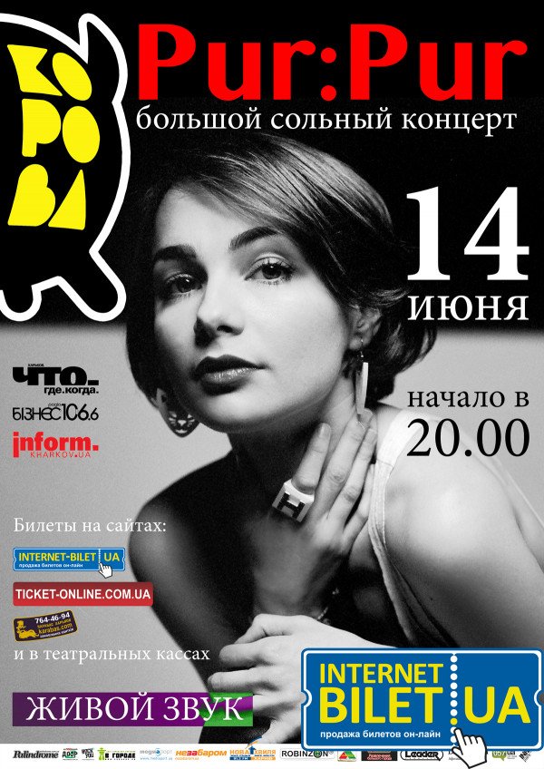 Pur:Pur відбудеться 14 червня 2013, 20:00, п’ятниця в Клуб "Корова". За допомогою сервісу internet-bilet.ua, Ви зможете з легкістю забронювати, замовити та купити квитки на концерт, спектакль, оперу, балет, майстер-класи, спортивні та дитячі заходи, що Вас цікавлять, оплативши їх найбільш зручним для Вас способом: через інтернет банківською карткою VISA/MasterCard, готівкою або кур'єром, якщо зробите замовлення квитка з доставкою.