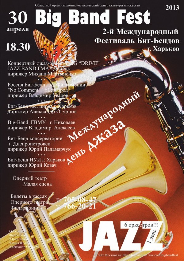 Оргкомитет II– го Международного Фестиваля "Big Band Fest", проходящего в малом зале Оперного театра в г. Харькове 30 апреля 2013г. в рамках Международного дня джаза, поздравляет всех любителей музыки с этим знаменательным событием!