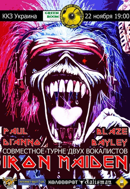 PAUL DI'ANNO & BLAZE BAYLEY (Совместный тур экс-вокалистов IRON MAIDEN) відбудеться 22 листопада 2013, 19:30, п’ятниця в ККЗ "Україна". За допомогою сервісу internet-bilet.ua, Ви зможете з легкістю забронювати, замовити та купити квитки на концерт, спектакль, оперу, балет, майстер-класи, спортивні та дитячі заходи, що Вас цікавлять, оплативши їх найбільш зручним для Вас способом: через інтернет банківською карткою VISA/MasterCard, готівкою або кур'єром, якщо зробите замовлення квитка з доставкою.