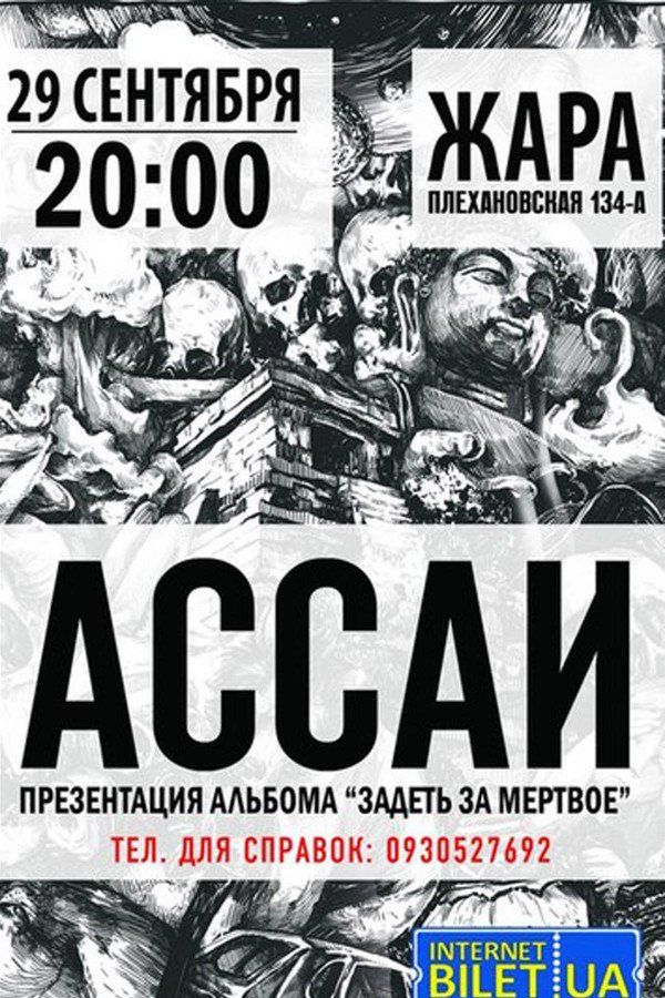 Ассаи відбудеться 29 вересня 2013, 19:00, неділя в Клуб "Жара". За допомогою сервісу internet-bilet.ua, Ви зможете з легкістю забронювати, замовити та купити квитки на концерт, спектакль, оперу, балет, майстер-класи, спортивні та дитячі заходи, що Вас цікавлять, оплативши їх найбільш зручним для Вас способом: через інтернет банківською карткою VISA/MasterCard, готівкою або кур'єром, якщо зробите замовлення квитка з доставкою.