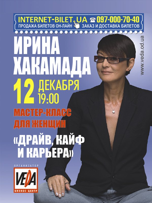 Ирина Хакамада відбудеться 12 грудня 2013, 19:00, четвер в Адміністративна будівля (колишній Radmir Expohall). За допомогою сервісу internet-bilet.ua, Ви зможете з легкістю забронювати, замовити та купити квитки на концерт, спектакль, оперу, балет, майстер-класи, спортивні та дитячі заходи, що Вас цікавлять, оплативши їх найбільш зручним для Вас способом: через інтернет банківською карткою VISA/MasterCard, готівкою або кур'єром, якщо зробите замовлення квитка з доставкою.