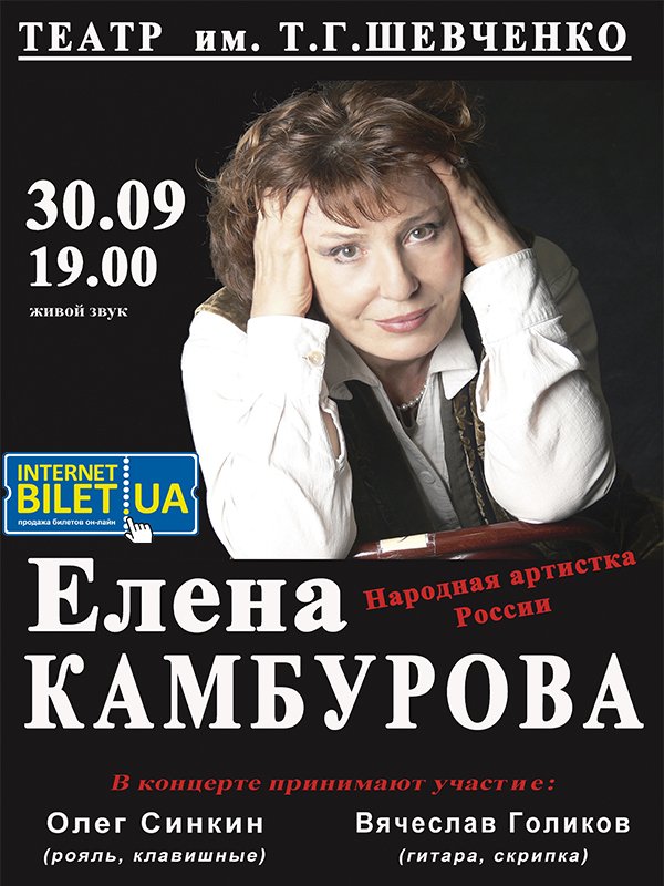 Елена Камбурова відбудеться 30 вересня 2013, 19:00, понеділок в Харківський театр ім. Т.Г. Шевченка. За допомогою сервісу internet-bilet.ua, Ви зможете з легкістю забронювати, замовити та купити квитки на концерт, спектакль, оперу, балет, майстер-класи, спортивні та дитячі заходи, що Вас цікавлять, оплативши їх найбільш зручним для Вас способом: через інтернет банківською карткою VISA/MasterCard, готівкою або кур'єром, якщо зробите замовлення квитка з доставкою.