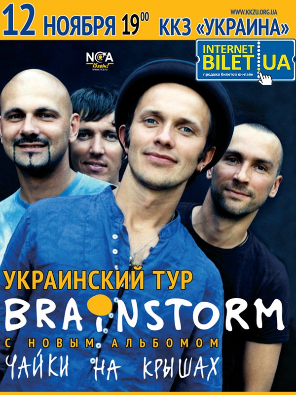 Brainstorm відбудеться 12 листопада 2013, 19:00, вівторок в ККЗ "Україна". За допомогою сервісу internet-bilet.ua, Ви зможете з легкістю забронювати, замовити та купити квитки на концерт, спектакль, оперу, балет, майстер-класи, спортивні та дитячі заходи, що Вас цікавлять, оплативши їх найбільш зручним для Вас способом: через інтернет банківською карткою VISA/MasterCard, готівкою або кур'єром, якщо зробите замовлення квитка з доставкою.