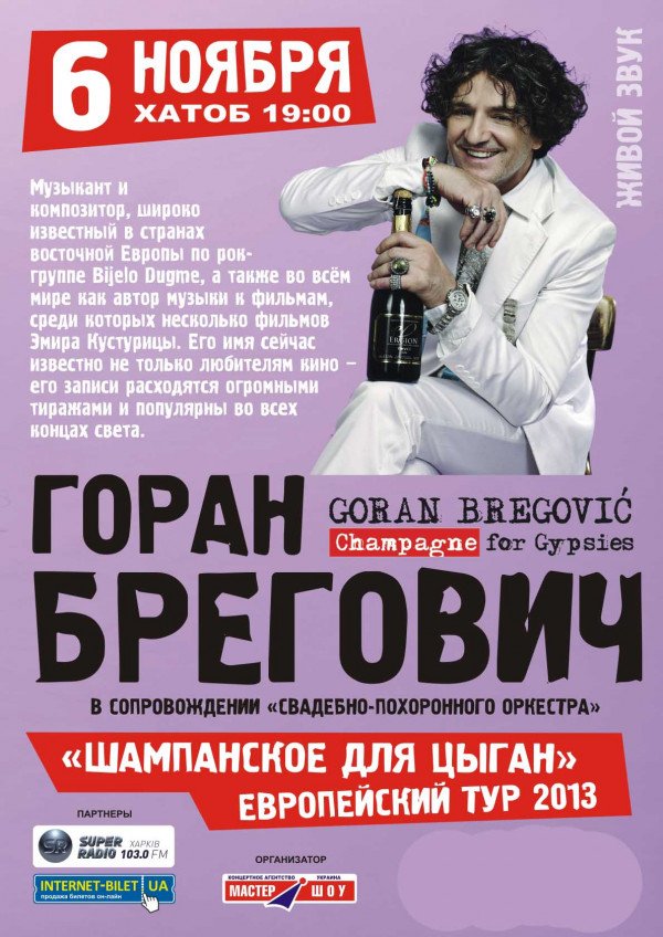 Горан Брегович відбудеться 6 листопада 2013, 19:00, середа в ХНАТОБ. За допомогою сервісу internet-bilet.ua, Ви зможете з легкістю забронювати, замовити та купити квитки на концерт, спектакль, оперу, балет, майстер-класи, спортивні та дитячі заходи, що Вас цікавлять, оплативши їх найбільш зручним для Вас способом: через інтернет банківською карткою VISA/MasterCard, готівкою або кур'єром, якщо зробите замовлення квитка з доставкою.