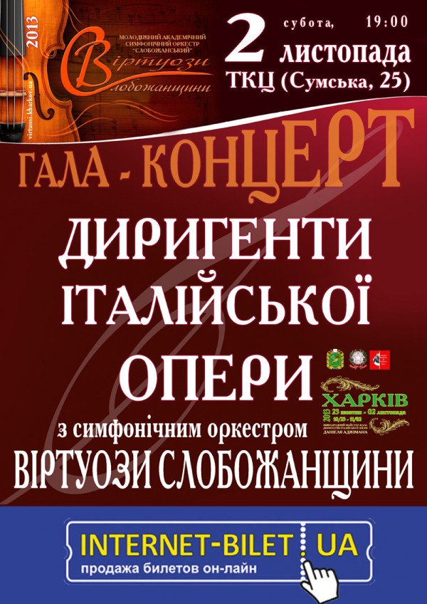 Гала-концерт. Дирижеры итальянской оперы. відбудеться 2 листопада 2013, 19:00, субота в ТЕАТРАЛЬНО-КОНЦЕРТНИЙ ЦЕНТР. За допомогою сервісу internet-bilet.ua, Ви зможете з легкістю забронювати, замовити та купити квитки на концерт, спектакль, оперу, балет, майстер-класи, спортивні та дитячі заходи, що Вас цікавлять, оплативши їх найбільш зручним для Вас способом: через інтернет банківською карткою VISA/MasterCard, готівкою або кур'єром, якщо зробите замовлення квитка з доставкою.
