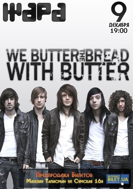 We Butter The Bread With Butter відбудеться 9 грудня 2013, 19:00, понеділок в Клуб "Жара". За допомогою сервісу internet-bilet.ua, Ви зможете з легкістю забронювати, замовити та купити квитки на концерт, спектакль, оперу, балет, майстер-класи, спортивні та дитячі заходи, що Вас цікавлять, оплативши їх найбільш зручним для Вас способом: через інтернет банківською карткою VISA/MasterCard, готівкою або кур'єром, якщо зробите замовлення квитка з доставкою.