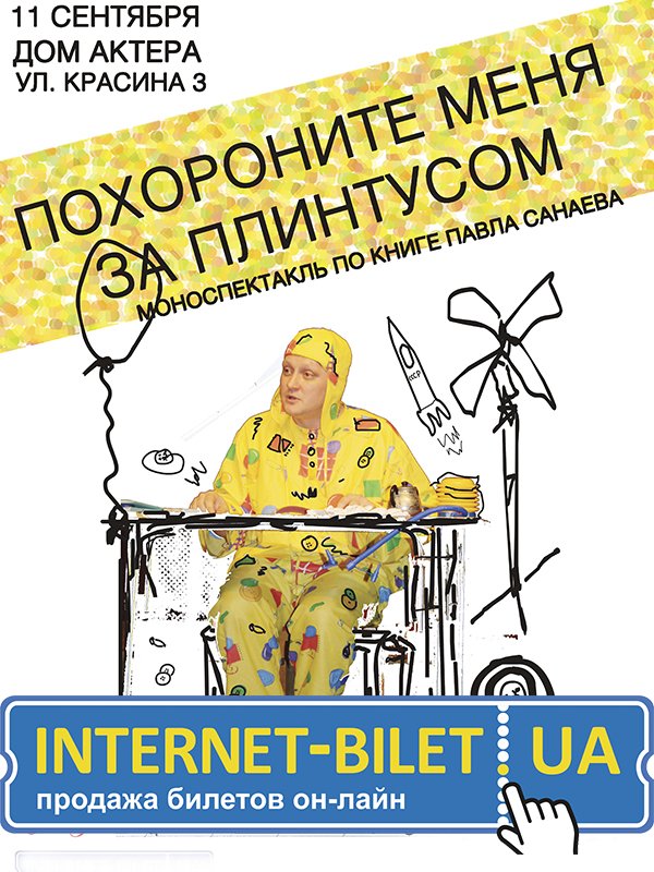 "Похороните меня за плинтусом" відбудеться 11 вересня 2013, 19:00, середа в Будинок Актора. За допомогою сервісу internet-bilet.ua, Ви зможете з легкістю забронювати, замовити та купити квитки на концерт, спектакль, оперу, балет, майстер-класи, спортивні та дитячі заходи, що Вас цікавлять, оплативши їх найбільш зручним для Вас способом: через інтернет банківською карткою VISA/MasterCard, готівкою або кур'єром, якщо зробите замовлення квитка з доставкою.