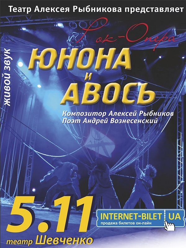 Юнона и Авось відбудеться 5 листопада 2013, 19:00, вівторок в Харківський театр ім. Т.Г. Шевченка. За допомогою сервісу internet-bilet.ua, Ви зможете з легкістю забронювати, замовити та купити квитки на концерт, спектакль, оперу, балет, майстер-класи, спортивні та дитячі заходи, що Вас цікавлять, оплативши їх найбільш зручним для Вас способом: через інтернет банківською карткою VISA/MasterCard, готівкою або кур'єром, якщо зробите замовлення квитка з доставкою.