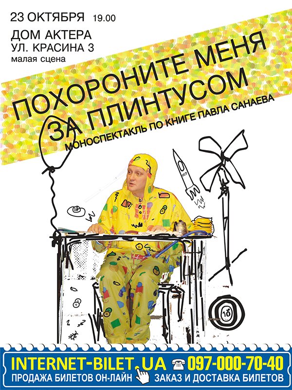"Похороните меня за плинтусом" відбудеться 23 жовтня 2013, 19:00, середа в Будинок Актора. За допомогою сервісу internet-bilet.ua, Ви зможете з легкістю забронювати, замовити та купити квитки на концерт, спектакль, оперу, балет, майстер-класи, спортивні та дитячі заходи, що Вас цікавлять, оплативши їх найбільш зручним для Вас способом: через інтернет банківською карткою VISA/MasterCard, готівкою або кур'єром, якщо зробите замовлення квитка з доставкою.