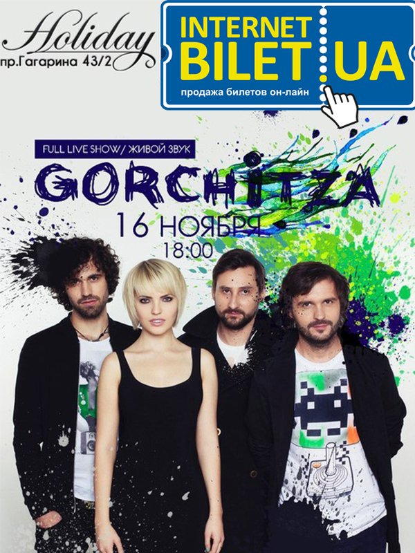 GORCHITZA відбудеться 16 листопада 2013, 18:00, субота в Holiday club. За допомогою сервісу internet-bilet.ua, Ви зможете з легкістю забронювати, замовити та купити квитки на концерт, спектакль, оперу, балет, майстер-класи, спортивні та дитячі заходи, що Вас цікавлять, оплативши їх найбільш зручним для Вас способом: через інтернет банківською карткою VISA/MasterCard, готівкою або кур'єром, якщо зробите замовлення квитка з доставкою.