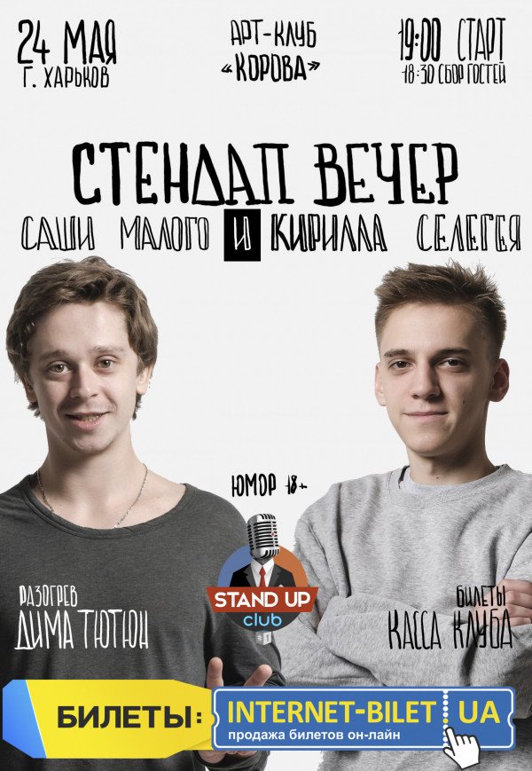 Стендап вечір Селегея і Малого / Stand Up Club # 1 відбудеться 24 травня 2019, 19:00, п’ятниця в Клуб "Корова". За допомогою сервісу internet-bilet.ua, Ви зможете з легкістю забронювати, замовити та купити квитки на концерт, спектакль, оперу, балет, майстер-класи, спортивні та дитячі заходи, що Вас цікавлять, оплативши їх найбільш зручним для Вас способом: через інтернет банківською карткою VISA/MasterCard, готівкою або кур'єром, якщо зробите замовлення квитка з доставкою.