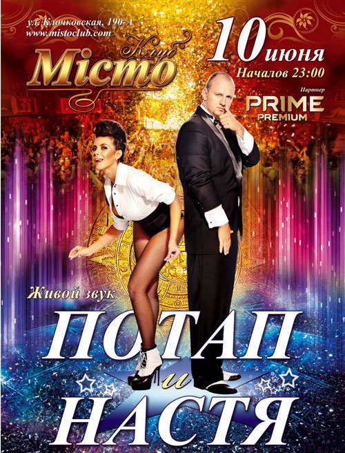 Потап и Настя відбудеться 10 червня 2011, 23:00, п’ятниця в Клуб "Мiсто". За допомогою сервісу internet-bilet.ua, Ви зможете з легкістю забронювати, замовити та купити квитки на концерт, спектакль, оперу, балет, майстер-класи, спортивні та дитячі заходи, що Вас цікавлять, оплативши їх найбільш зручним для Вас способом: через інтернет банківською карткою VISA/MasterCard, готівкою або кур'єром, якщо зробите замовлення квитка з доставкою.