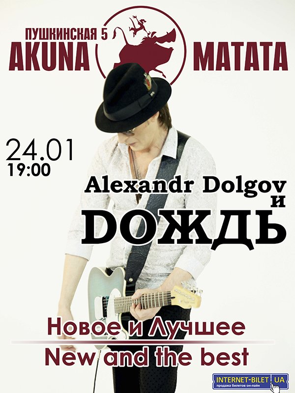 Александр Долгов и группа "Дождь" відбудеться 24 січня 2014, 19:00, п’ятниця в Akuna Matata. За допомогою сервісу internet-bilet.ua, Ви зможете з легкістю забронювати, замовити та купити квитки на концерт, спектакль, оперу, балет, майстер-класи, спортивні та дитячі заходи, що Вас цікавлять, оплативши їх найбільш зручним для Вас способом: через інтернет банківською карткою VISA/MasterCard, готівкою або кур'єром, якщо зробите замовлення квитка з доставкою.