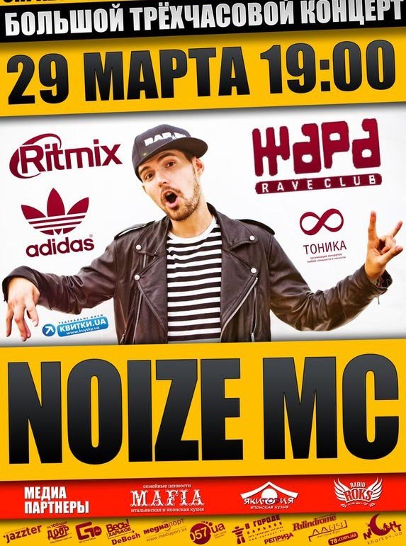 Noize MC (Харьков) відбудеться 29 березня 2012, 19:00, четвер в Клуб "Жара". За допомогою сервісу internet-bilet.ua, Ви зможете з легкістю забронювати, замовити та купити квитки на концерт, спектакль, оперу, балет, майстер-класи, спортивні та дитячі заходи, що Вас цікавлять, оплативши їх найбільш зручним для Вас способом: через інтернет банківською карткою VISA/MasterCard, готівкою або кур'єром, якщо зробите замовлення квитка з доставкою.