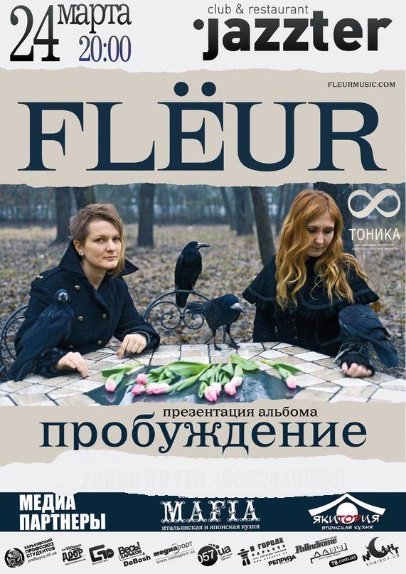 Fleur - Флёр (Харьков) відбудеться 24 березня 2012, 20:00, субота в Клуб "Jazzter". За допомогою сервісу internet-bilet.ua, Ви зможете з легкістю забронювати, замовити та купити квитки на концерт, спектакль, оперу, балет, майстер-класи, спортивні та дитячі заходи, що Вас цікавлять, оплативши їх найбільш зручним для Вас способом: через інтернет банківською карткою VISA/MasterCard, готівкою або кур'єром, якщо зробите замовлення квитка з доставкою.
