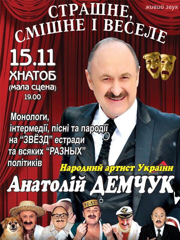 Вечер юмора Анатолия Демчука відбудеться 15 листопада 2014, 19:00, субота в ТЕАТРАЛЬНО-КОНЦЕРТНИЙ ЦЕНТР. За допомогою сервісу internet-bilet.ua, Ви зможете з легкістю забронювати, замовити та купити квитки на концерт, спектакль, оперу, балет, майстер-класи, спортивні та дитячі заходи, що Вас цікавлять, оплативши їх найбільш зручним для Вас способом: через інтернет банківською карткою VISA/MasterCard, готівкою або кур'єром, якщо зробите замовлення квитка з доставкою.