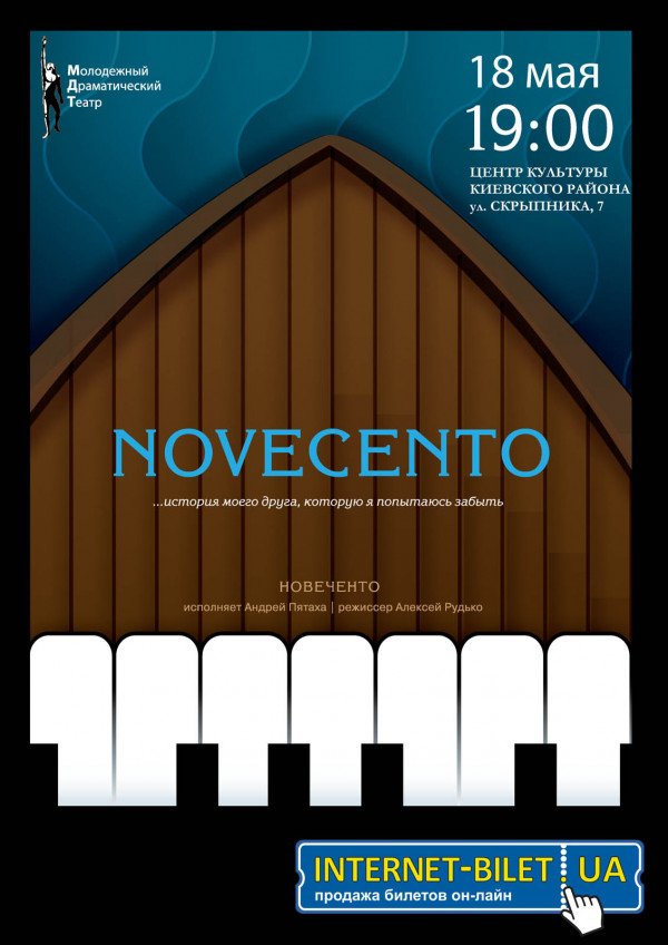 NOVECENTO відбудеться 18 травня 2012, 19:00, п’ятниця в Муніципальний центр культурних ініціатив (ПК Зв'язку). За допомогою сервісу internet-bilet.ua, Ви зможете з легкістю забронювати, замовити та купити квитки на концерт, спектакль, оперу, балет, майстер-класи, спортивні та дитячі заходи, що Вас цікавлять, оплативши їх найбільш зручним для Вас способом: через інтернет банківською карткою VISA/MasterCard, готівкою або кур'єром, якщо зробите замовлення квитка з доставкою.