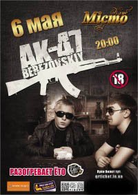 АК-47 відбудеться 6 травня 2012, 20:00, неділя в Клуб "Мiсто". За допомогою сервісу internet-bilet.ua, Ви зможете з легкістю забронювати, замовити та купити квитки на концерт, спектакль, оперу, балет, майстер-класи, спортивні та дитячі заходи, що Вас цікавлять, оплативши їх найбільш зручним для Вас способом: через інтернет банківською карткою VISA/MasterCard, готівкою або кур'єром, якщо зробите замовлення квитка з доставкою.