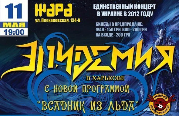 Эпидемия відбудеться 11 травня 2012, 19:00, п’ятниця в Клуб "Жара". За допомогою сервісу internet-bilet.ua, Ви зможете з легкістю забронювати, замовити та купити квитки на концерт, спектакль, оперу, балет, майстер-класи, спортивні та дитячі заходи, що Вас цікавлять, оплативши їх найбільш зручним для Вас способом: через інтернет банківською карткою VISA/MasterCard, готівкою або кур'єром, якщо зробите замовлення квитка з доставкою.