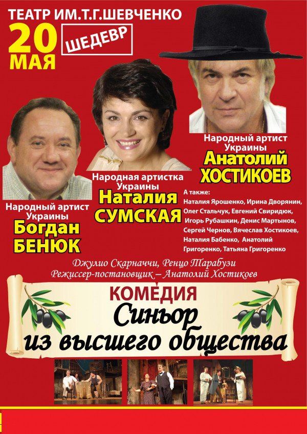 «Моя профессия – синьор из высшего общества» відбудеться 20 травня 2015, 19:00, середа в Харківський театр ім. Т.Г. Шевченка. За допомогою сервісу internet-bilet.ua, Ви зможете з легкістю забронювати, замовити та купити квитки на концерт, спектакль, оперу, балет, майстер-класи, спортивні та дитячі заходи, що Вас цікавлять, оплативши їх найбільш зручним для Вас способом: через інтернет банківською карткою VISA/MasterCard, готівкою або кур'єром, якщо зробите замовлення квитка з доставкою.