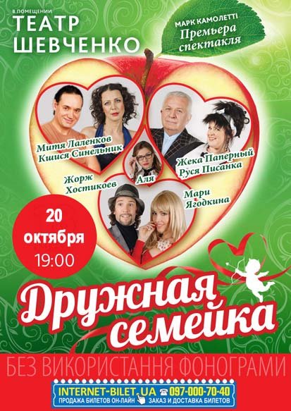 Дружная семейка відбудеться 18 травня 2015, 19:00, понеділок в Харківський театр ім. Т.Г. Шевченка. За допомогою сервісу internet-bilet.ua, Ви зможете з легкістю забронювати, замовити та купити квитки на концерт, спектакль, оперу, балет, майстер-класи, спортивні та дитячі заходи, що Вас цікавлять, оплативши їх найбільш зручним для Вас способом: через інтернет банківською карткою VISA/MasterCard, готівкою або кур'єром, якщо зробите замовлення квитка з доставкою.