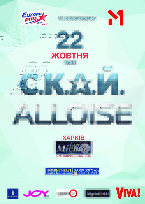 С.К.А.Й. + ALLOISE відбудеться 22 вересня 2015, 19:00, вівторок в Клуб Місто. За допомогою сервісу internet-bilet.ua, Ви зможете з легкістю забронювати, замовити та купити квитки на концерт, спектакль, оперу, балет, майстер-класи, спортивні та дитячі заходи, що Вас цікавлять, оплативши їх найбільш зручним для Вас способом: через інтернет банківською карткою VISA/MasterCard, готівкою або кур'єром, якщо зробите замовлення квитка з доставкою.