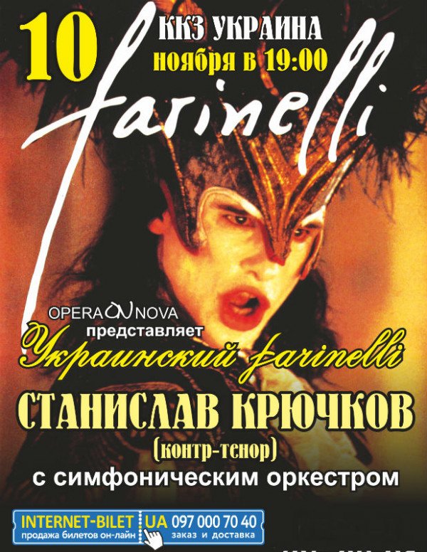 Украинский farinelli. Станислав Крючков відбудеться 10 листопада 2015, 19:00, вівторок в ККЗ "Україна". За допомогою сервісу internet-bilet.ua, Ви зможете з легкістю забронювати, замовити та купити квитки на концерт, спектакль, оперу, балет, майстер-класи, спортивні та дитячі заходи, що Вас цікавлять, оплативши їх найбільш зручним для Вас способом: через інтернет банківською карткою VISA/MasterCard, готівкою або кур'єром, якщо зробите замовлення квитка з доставкою.