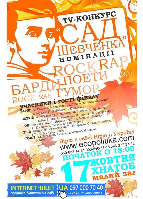 Финал TV-конкурса "Сад Шевченко" відбудеться 17 жовтня 2015, 18:00, субота в ТЕАТРАЛЬНО-КОНЦЕРТНИЙ ЦЕНТР. За допомогою сервісу internet-bilet.ua, Ви зможете з легкістю забронювати, замовити та купити квитки на концерт, спектакль, оперу, балет, майстер-класи, спортивні та дитячі заходи, що Вас цікавлять, оплативши їх найбільш зручним для Вас способом: через інтернет банківською карткою VISA/MasterCard, готівкою або кур'єром, якщо зробите замовлення квитка з доставкою.