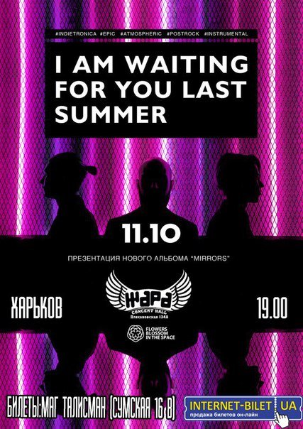 I am waiting for you last summer образовались в Рязани 3 года назад и быстро стали известны за ее пределами: группа дала за это время более 130 концертов от Барселоны до Гонконга, часто при полном аншлаге. Основным замыслом собравшегося коллектива было объединить атмосферное и вдумчивое звучание гитарного пост-рока и эмбиента с современной электронной сценой. В их музыке одновременно уживается и бессмертный роковый напор и холодный синтезаторный минимализм.