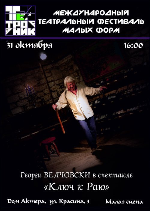 Фестиваль "Театроник". "Ключ к раю" (Болгария) відбудеться 31 жовтня 2015, 16:00, субота в Будинок Актора. За допомогою сервісу internet-bilet.ua, Ви зможете з легкістю забронювати, замовити та купити квитки на концерт, спектакль, оперу, балет, майстер-класи, спортивні та дитячі заходи, що Вас цікавлять, оплативши їх найбільш зручним для Вас способом: через інтернет банківською карткою VISA/MasterCard, готівкою або кур'єром, якщо зробите замовлення квитка з доставкою.